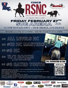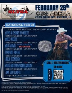 Location SugArena Acadiana Fairgrounds 713 Corporate Drive, New Iberia, LA 70560 Category Cattle Events Ranch Sorting Next Occurrence Go to occurrence page Date Feb 28 2026 Time All of the day Date Feb 27 2026 - Feb 28 2026 Cost Stall $15/night, Shavings $9/bag South Louisiana Team Sorting Association & RSNC Share this event + Add to Google Calendar + iCal export