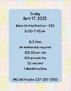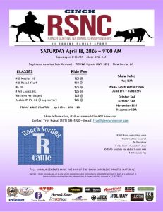 Location SugArena Acadiana Fairgrounds 713 Corporate Drive, New Iberia, LA 70560 Category Ranch Sorting Next Occurrence Go to occurrence page Date May 16 2026 Time All of the day Date May 15 2026 Cost Stall $15/night, shaving $9/bag, RV $30 night/$50 weekend TR Cattle / RSNC MORE INFORMATION COMING SOON… Share this event + Add to Google Calendar + iCal export